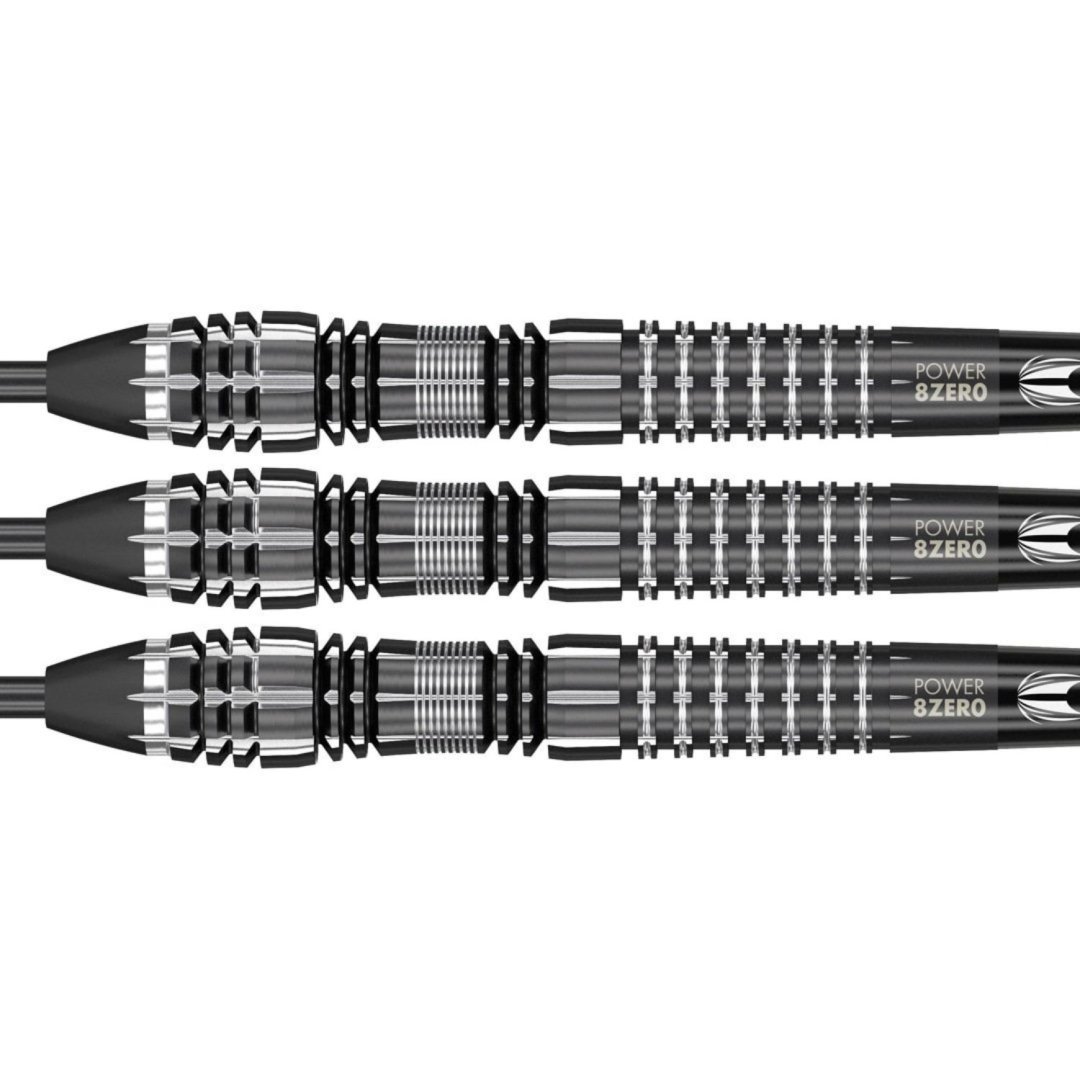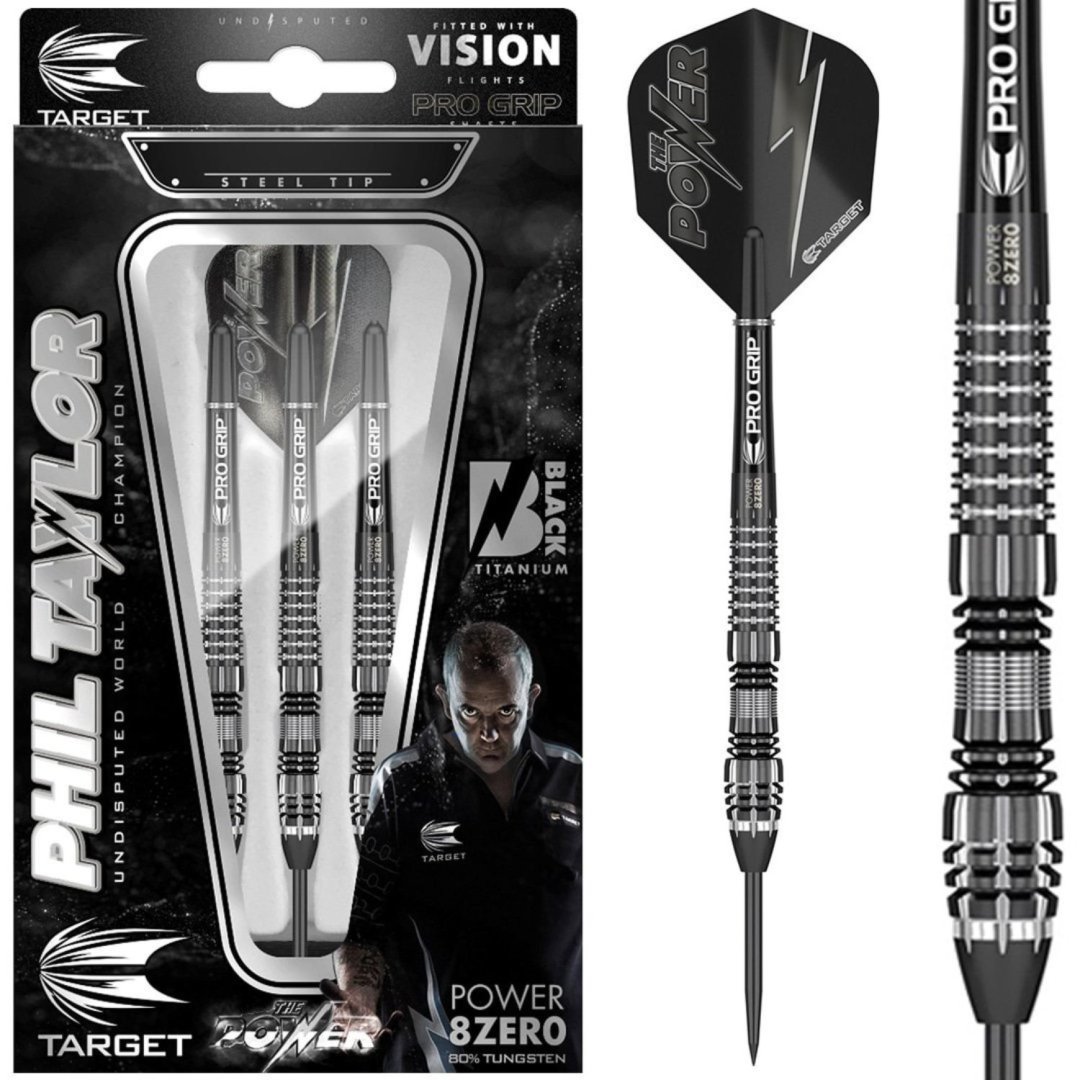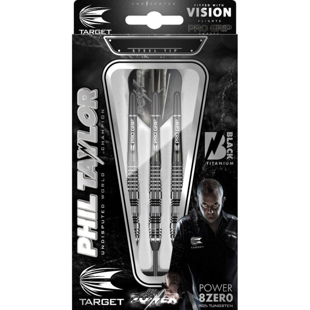 Steelové šípky Power 8Zero - Phil Taylor sú volfrámové šípky (80% tungsten) s čiernymi barrely v jedinečnom dizajne. Barrely sú doplnené nylonovými násadkami Pro Grip a letkami The Power.